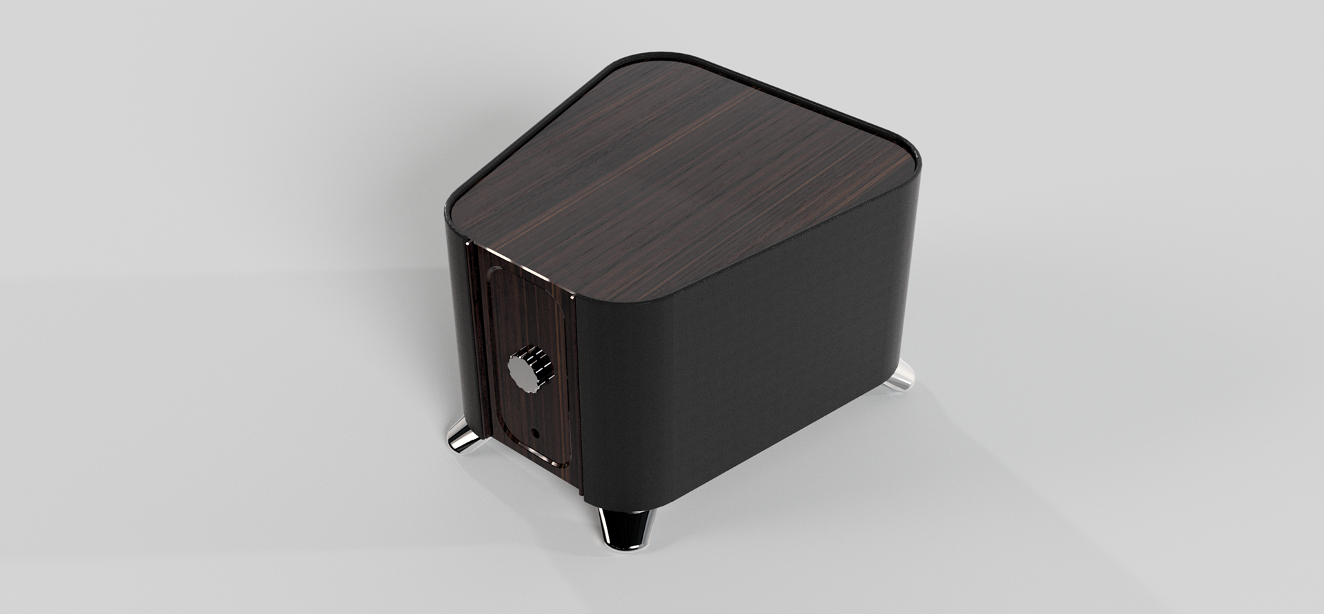Its squat, muscular stance and chrome-tipped feet minimize vibration while maximizing presence. Hidden beneath its fabric-wrapped exterior is the raw power needed to bring depth to every beat and breath.