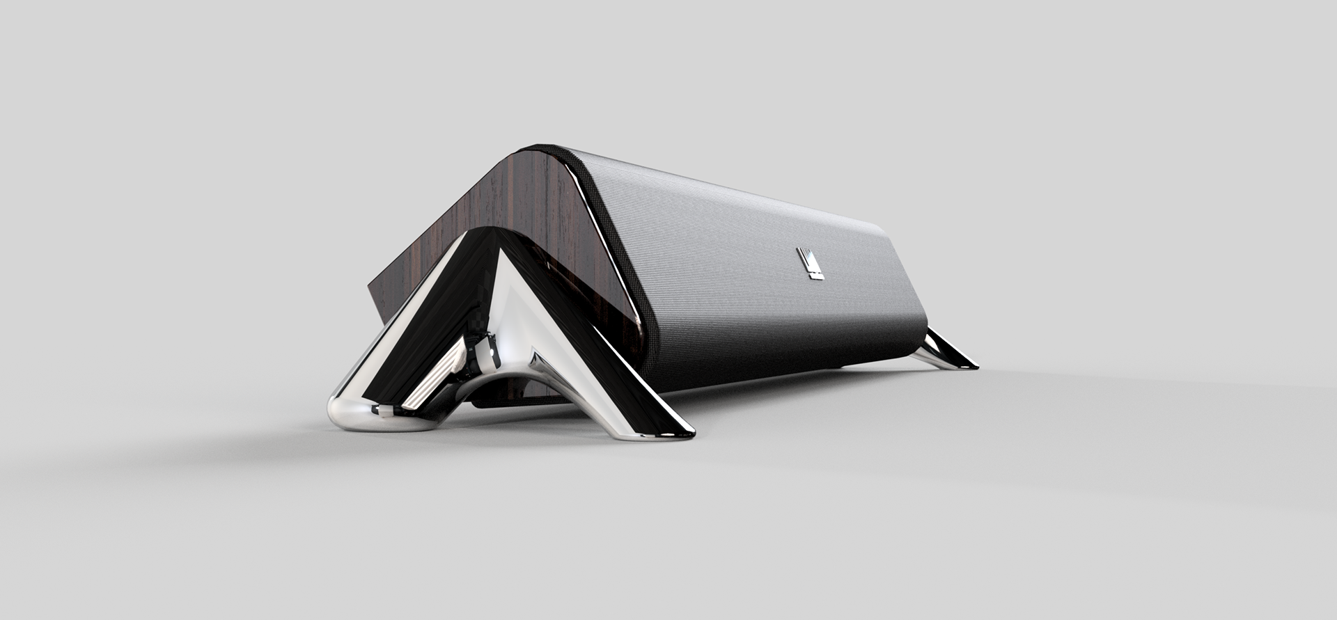 Supported by striking chrome outriggers, its wedge-shaped wooden chassis is angled perfectly to fill your living space with crystal-clear dialogue and soaring mid-tones.