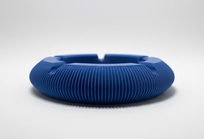 The ASH tray personal project represents a seamless intersection of digital craft and physical manufacturing. Modeled with mathematical precision in Fusion 360 having to keep in mind physical limits of my 3D printer, the body features a striking radial rib texture that challenges traditional 3D printing aesthetics.