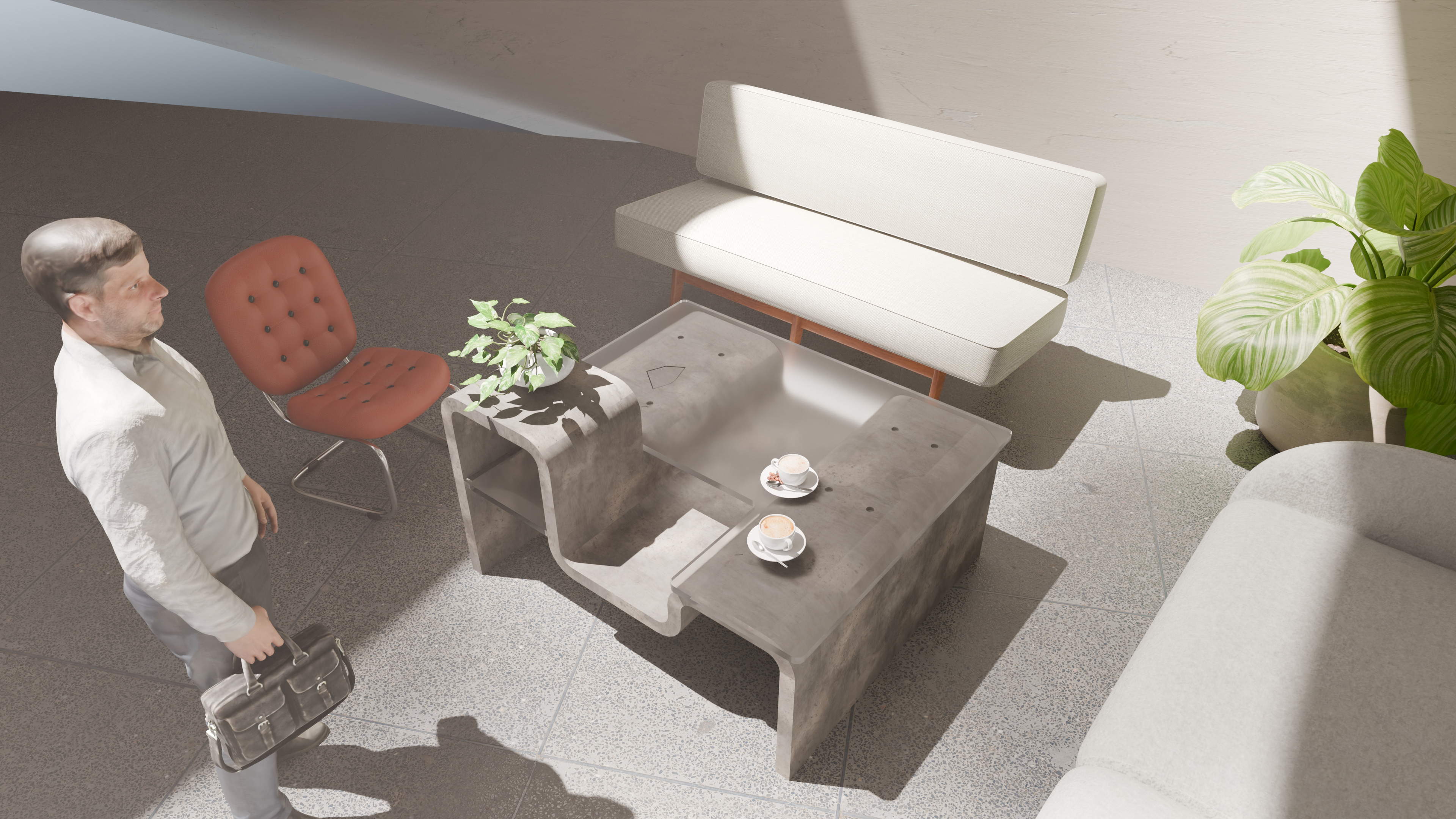 To meet these needs, I developed a two-level structure that keeps each function clearly defined while maintaining a cohesive form. The upper level serves as the main tabletop for everyday use and entertaining, while the lower section accommodates a planter, introducing a touch of greenery into the living space. The L-shaped tabletop was intentionally designed to complement the layout of the living room’s sofa arrangement, ensuring both visual harmony and functional accessibility.